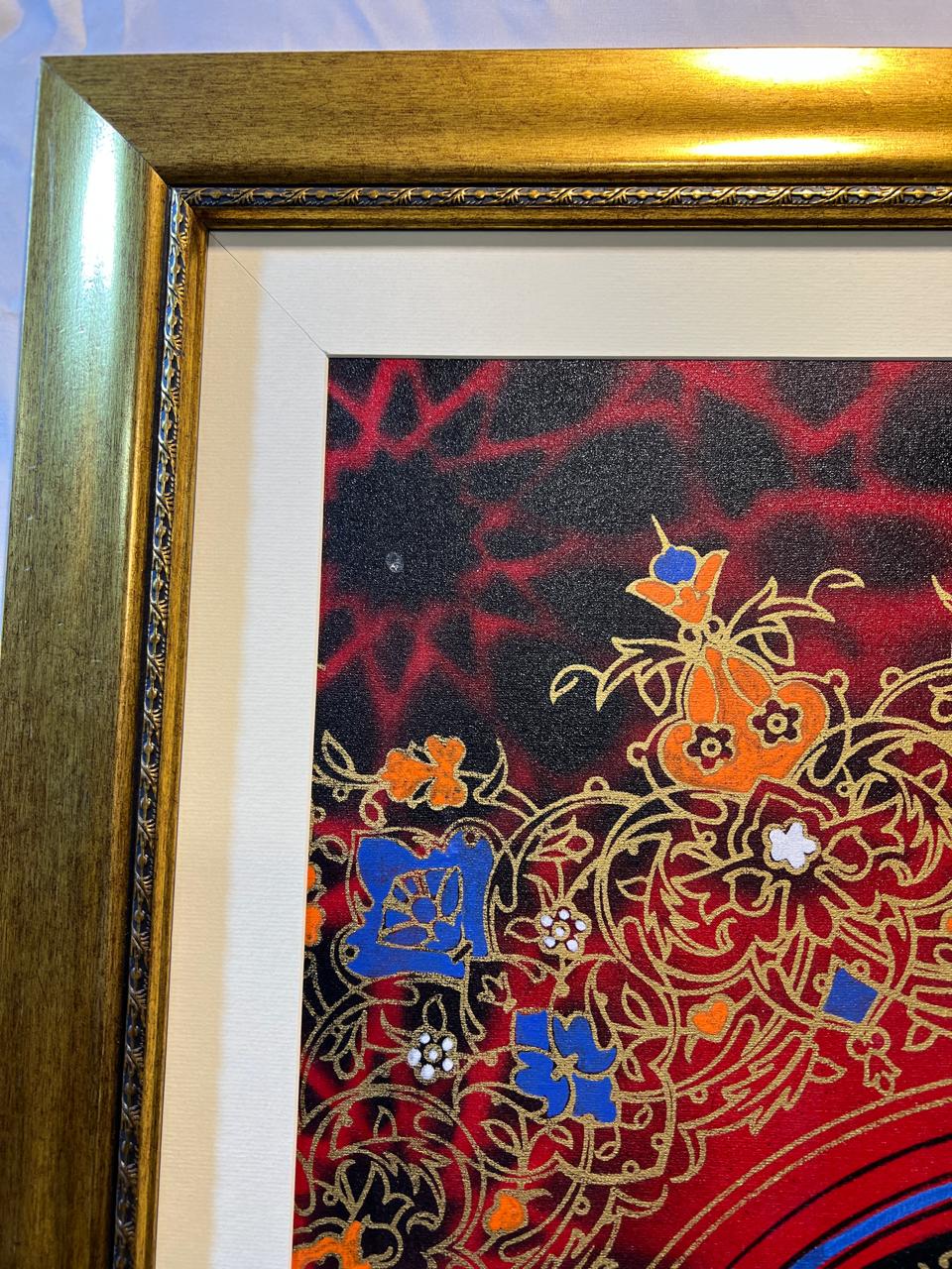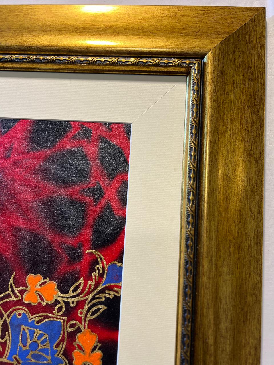 The vibrant combination of red, gold, and blue tones symbolizes gratitude and divine beauty, making it a perfect addition to any sophisticated interior, prayer room, or gallery wall.