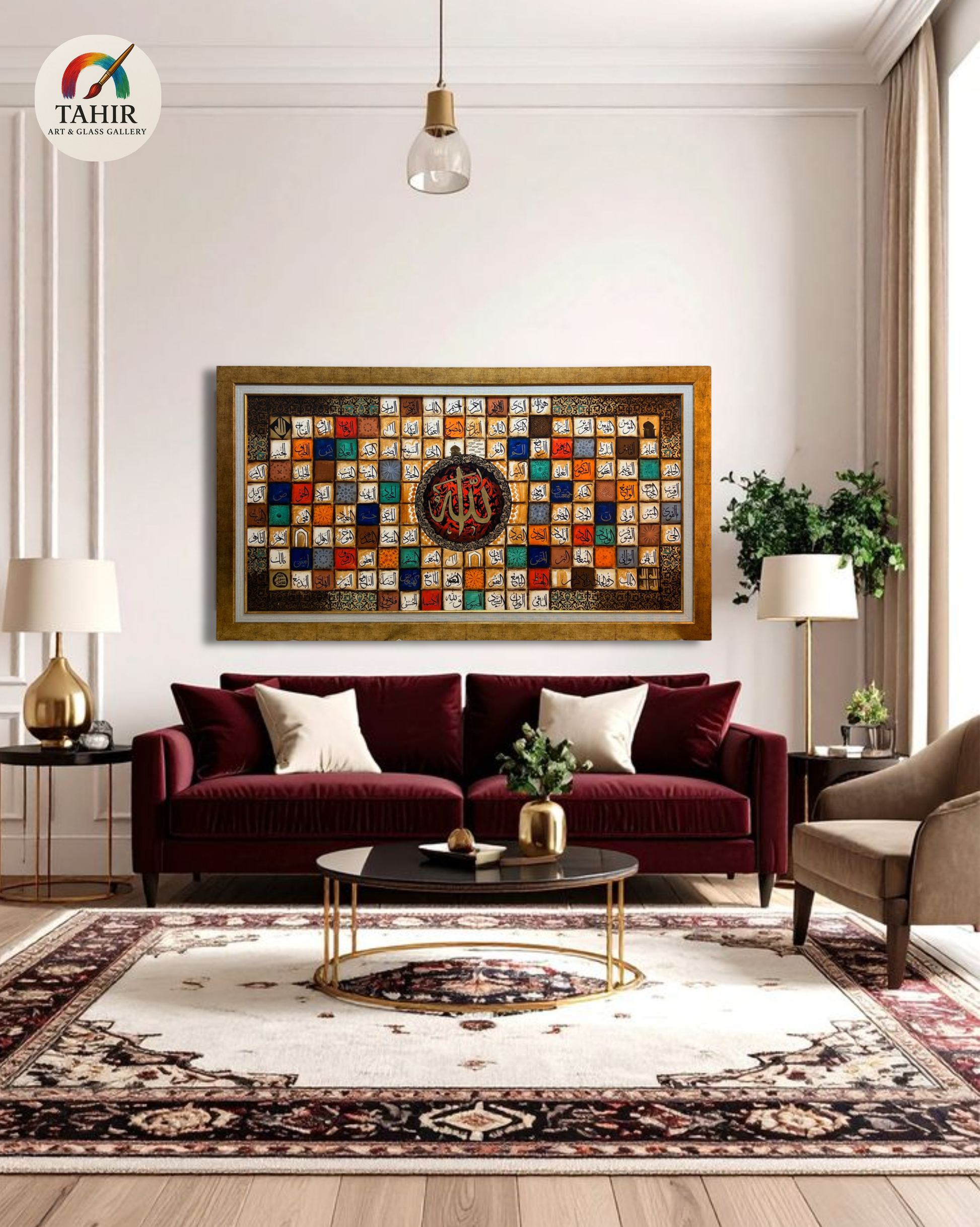 A masterpiece of devotion and artistry — this handmade Arabic calligraphy painting beautifully features the 99 Names of Allah (Asma-ul-Husna) in elegant script.