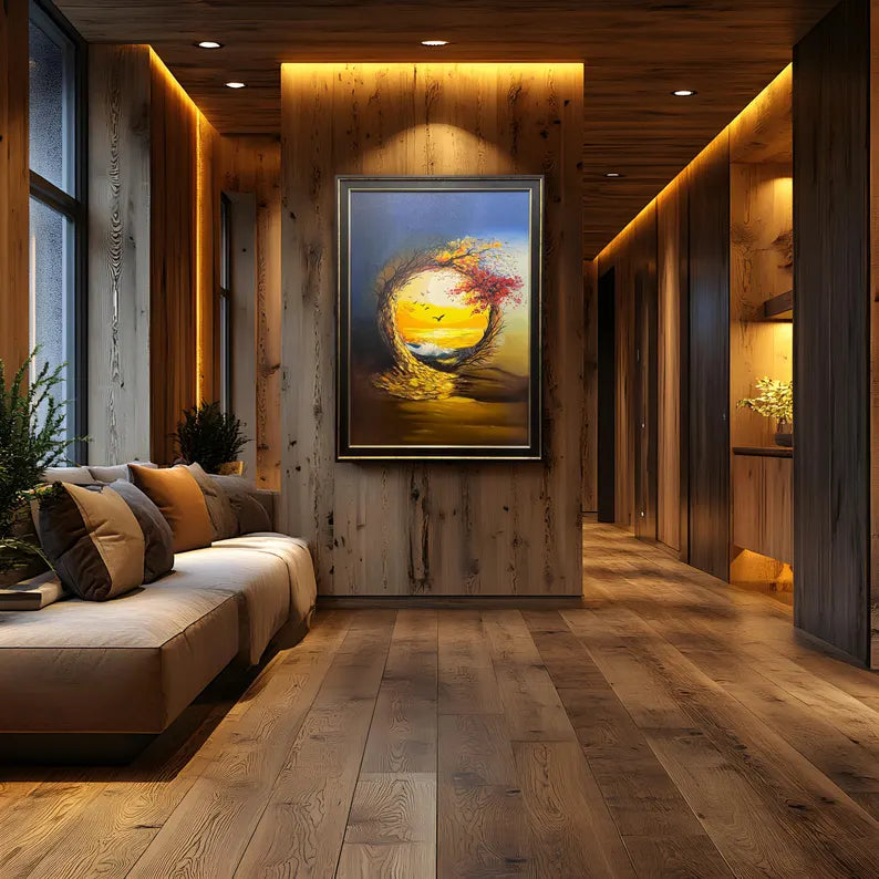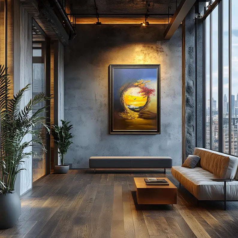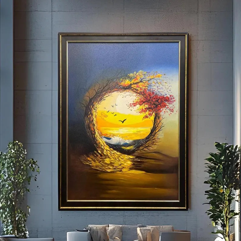 Handmade Oil Painting Wall Art – Sunset Tree Circle | Framed Canvas (32 × 44 Inches)