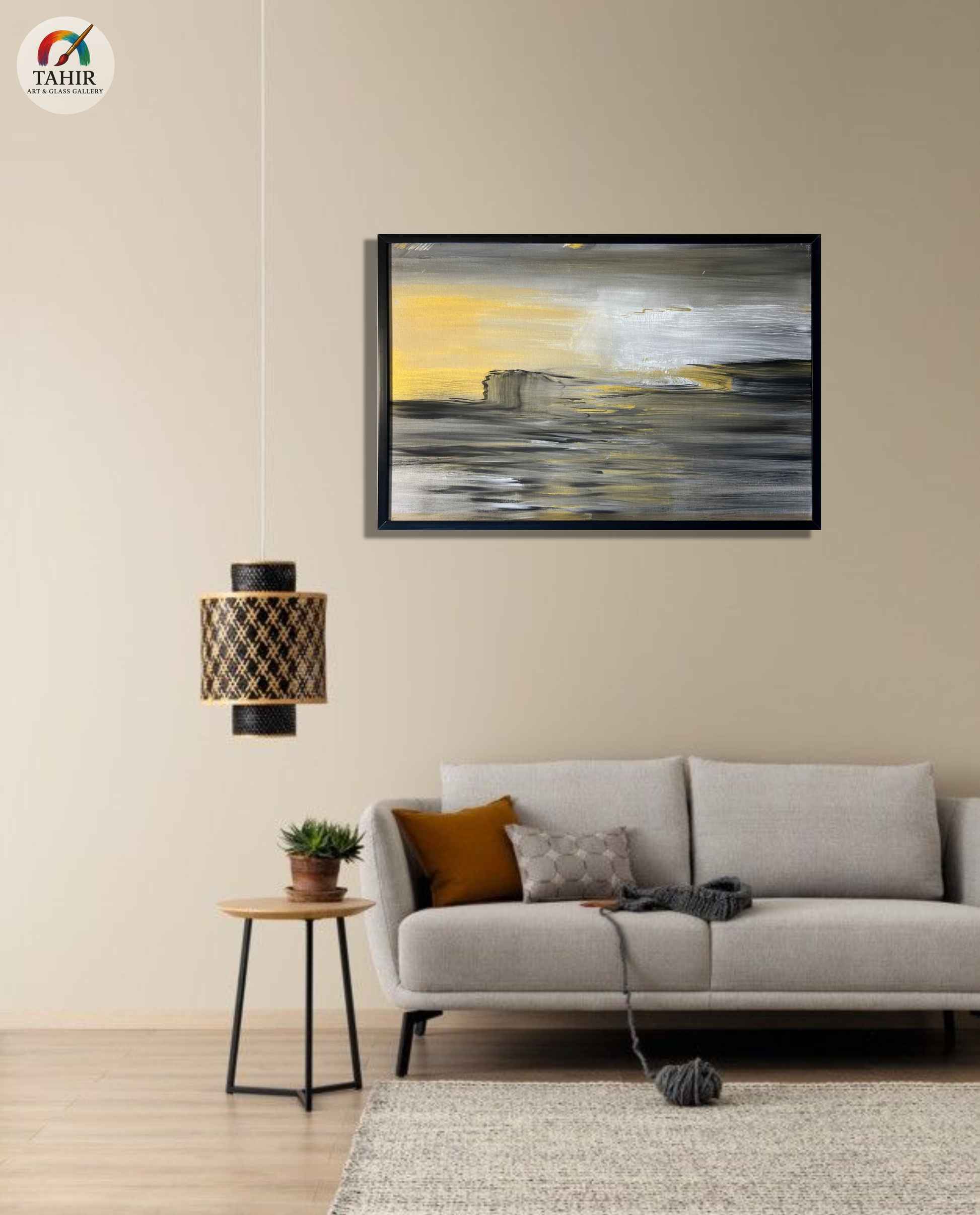 Experience calm and contrast with "Golden Horizon", a 24x36 inch original canvas painting that merges soft golden tones with bold greys and blacks. The brush strokes reflect movement and light, offering a serene, modern statement for your home or office.