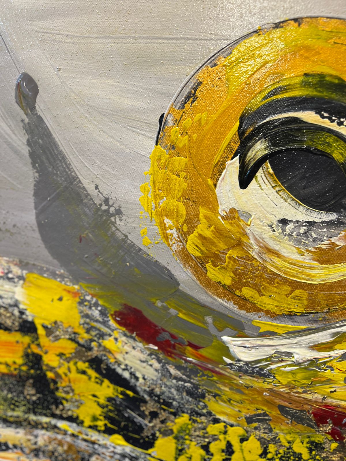 The painting features a bold yellow sun, abstract strokes, and dynamic textures that create a sense of movement and energy. Perfect for modern interiors, home offices, or creative studios, this piece adds a splash of color and sophistication to any space.