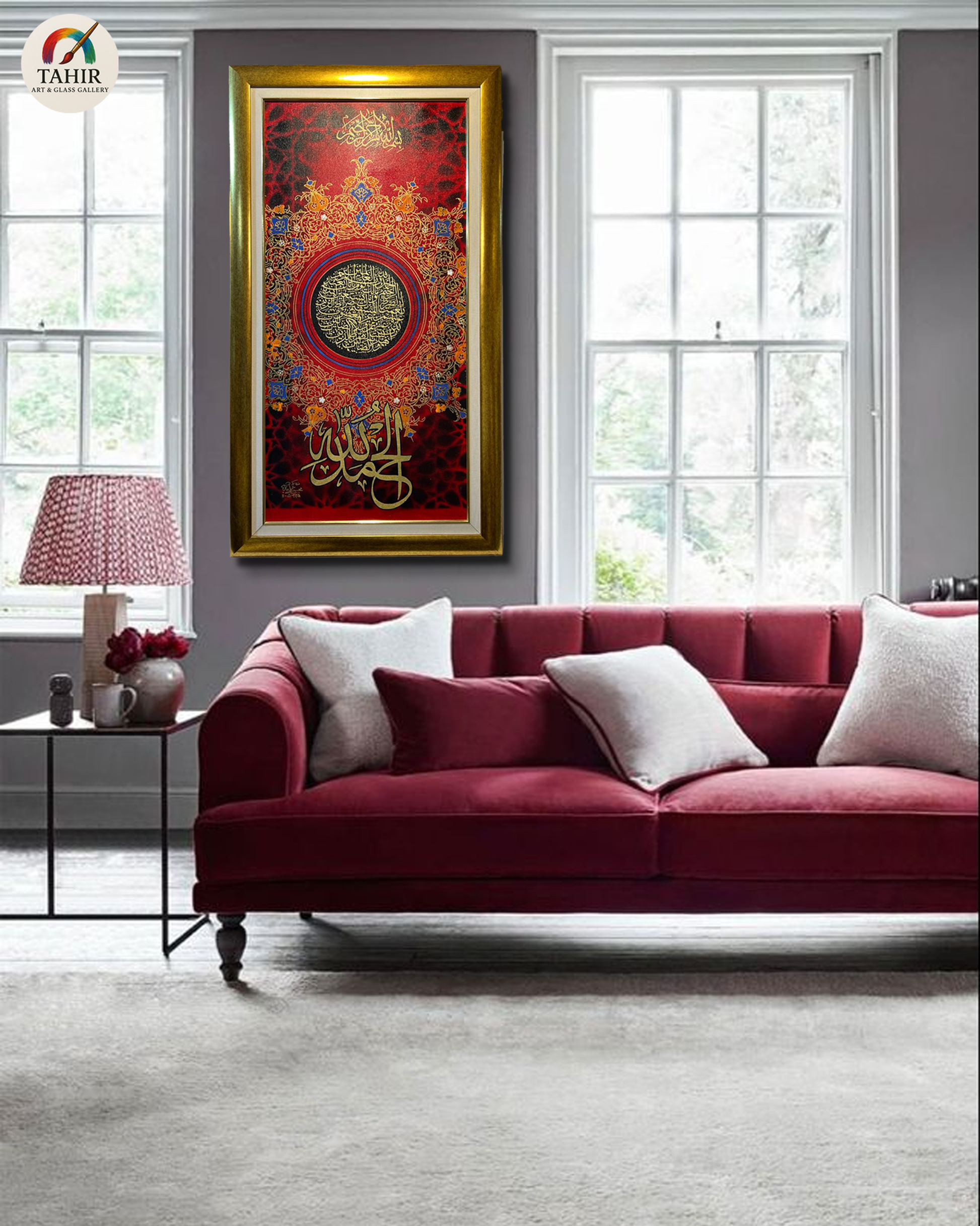 This exquisite piece showcases elegant Arabic calligraphy surrounded by intricate geometric and floral motifs in rich shades of crimson, gold, and blue — symbolizing spirituality, harmony, and devotion.