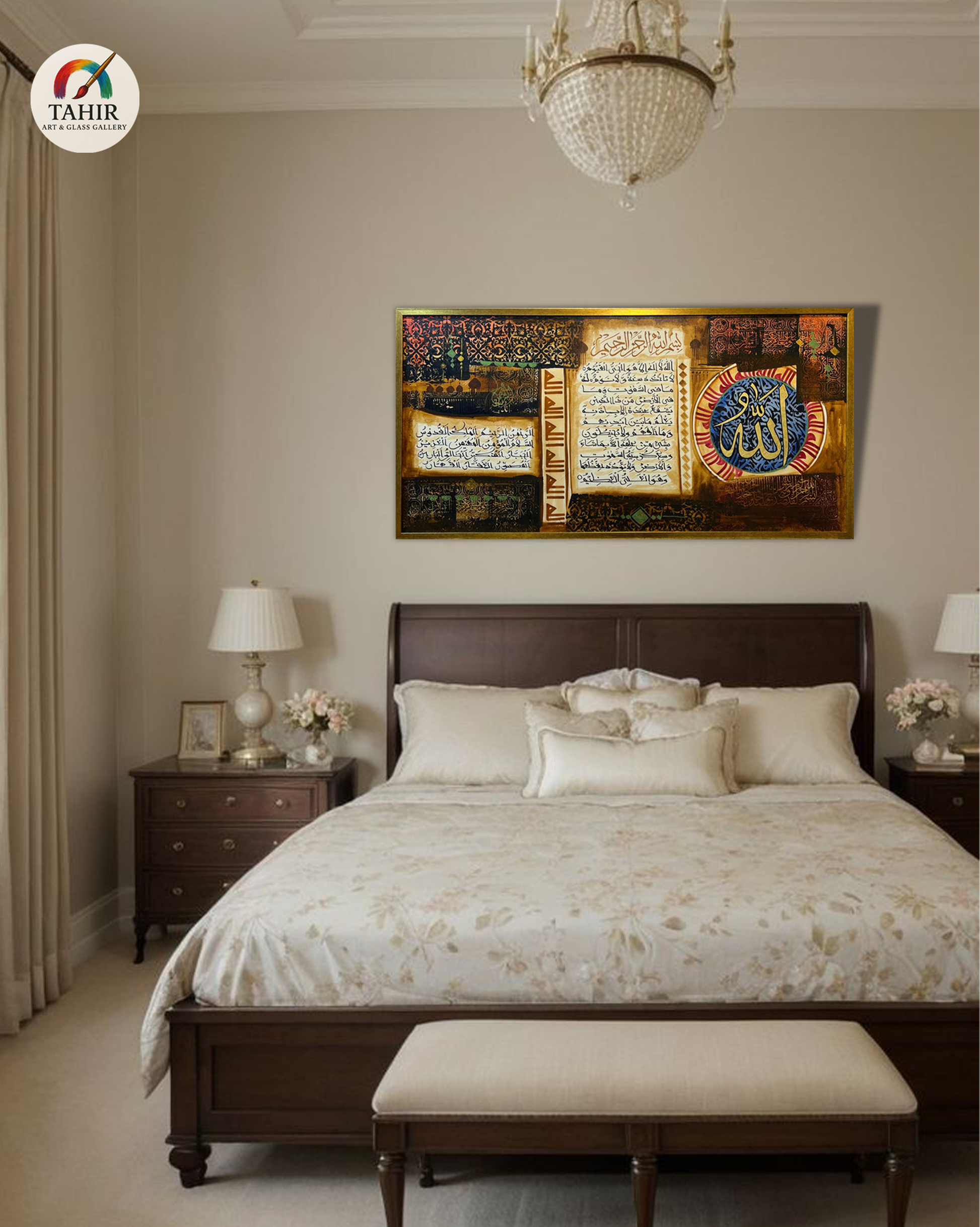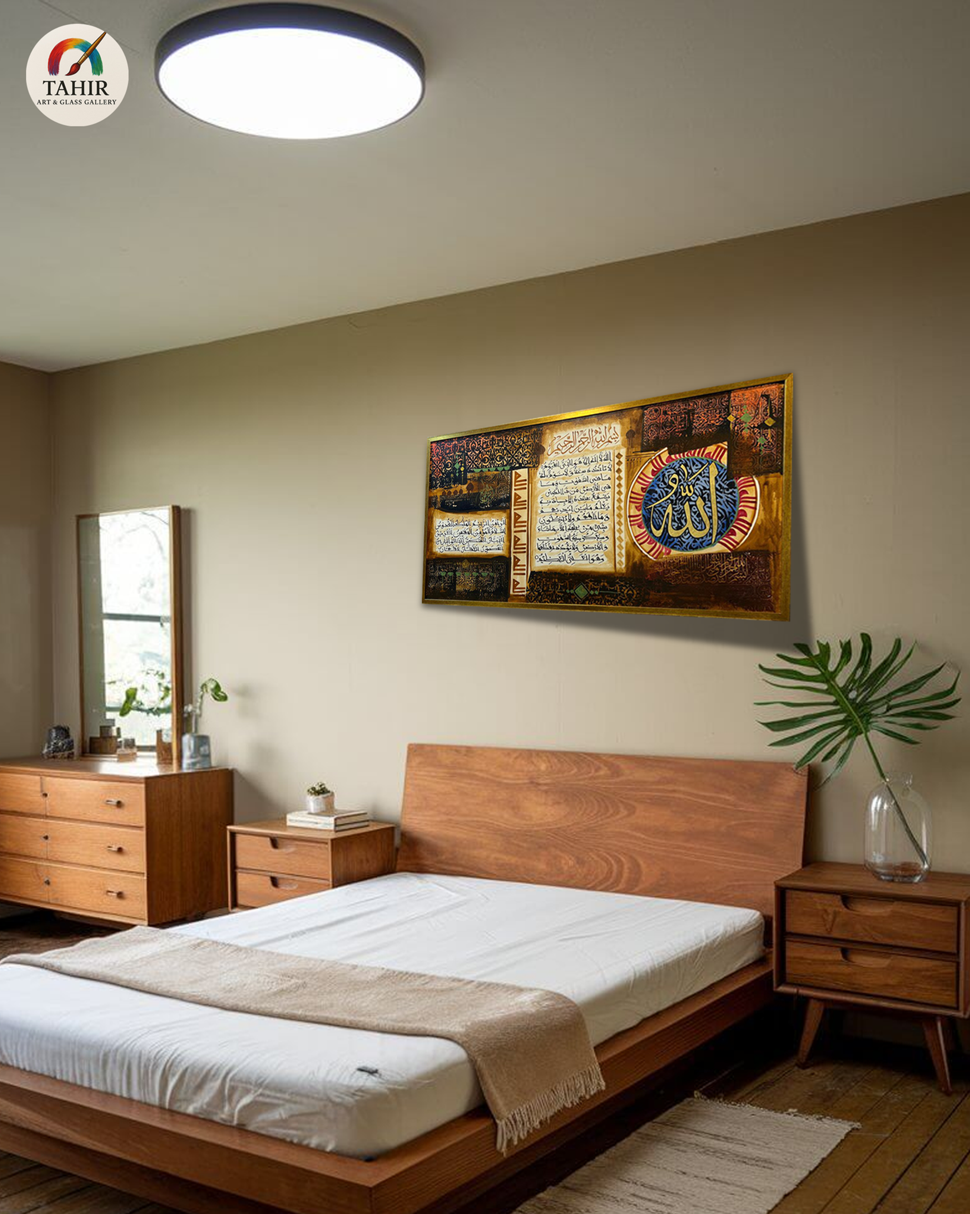 Enhance your living space with this handmade oil painting featuring the beautiful verses of Surah Al-Fatiha along with the divine name “Allah” in traditional Arabic calligraphy.
