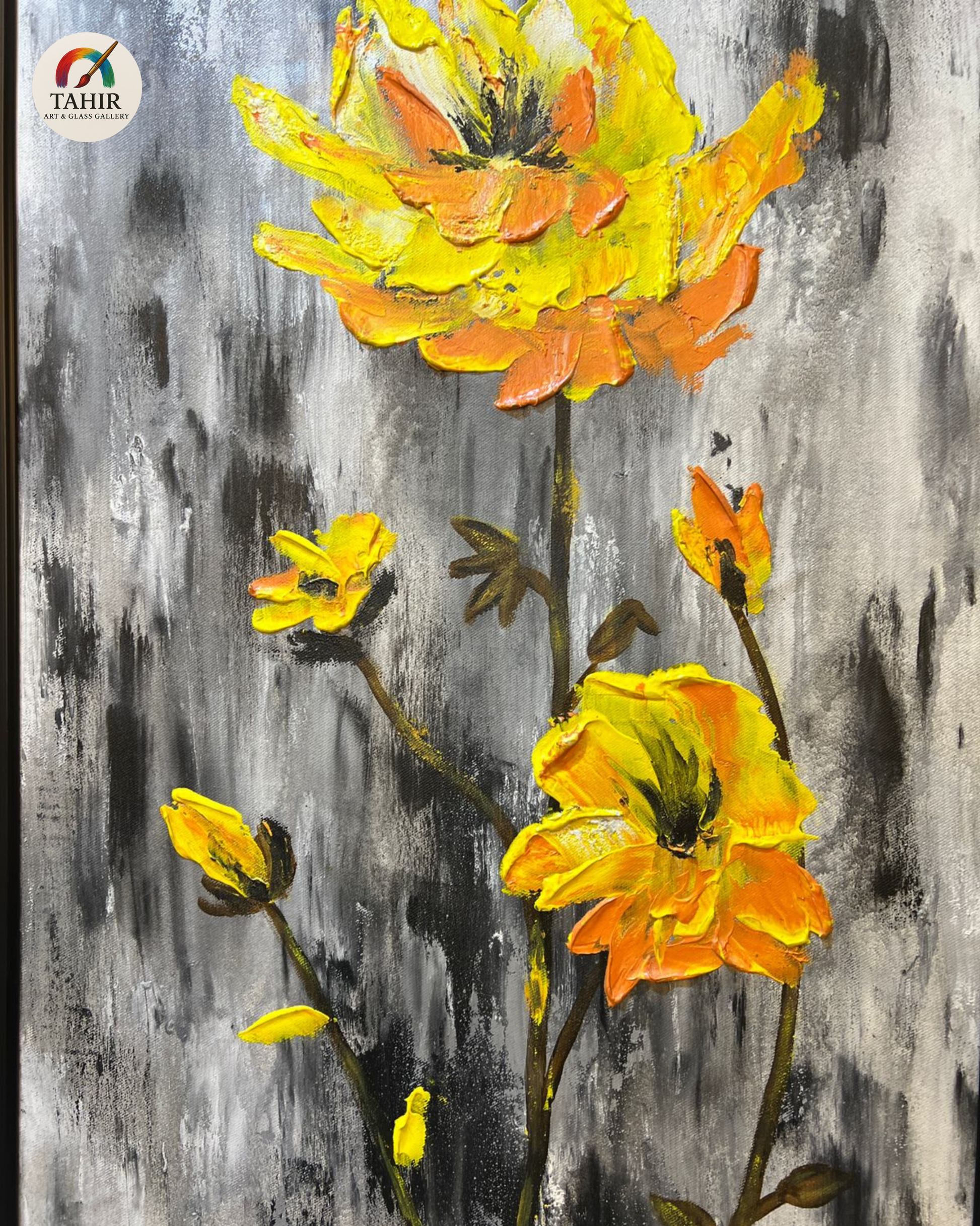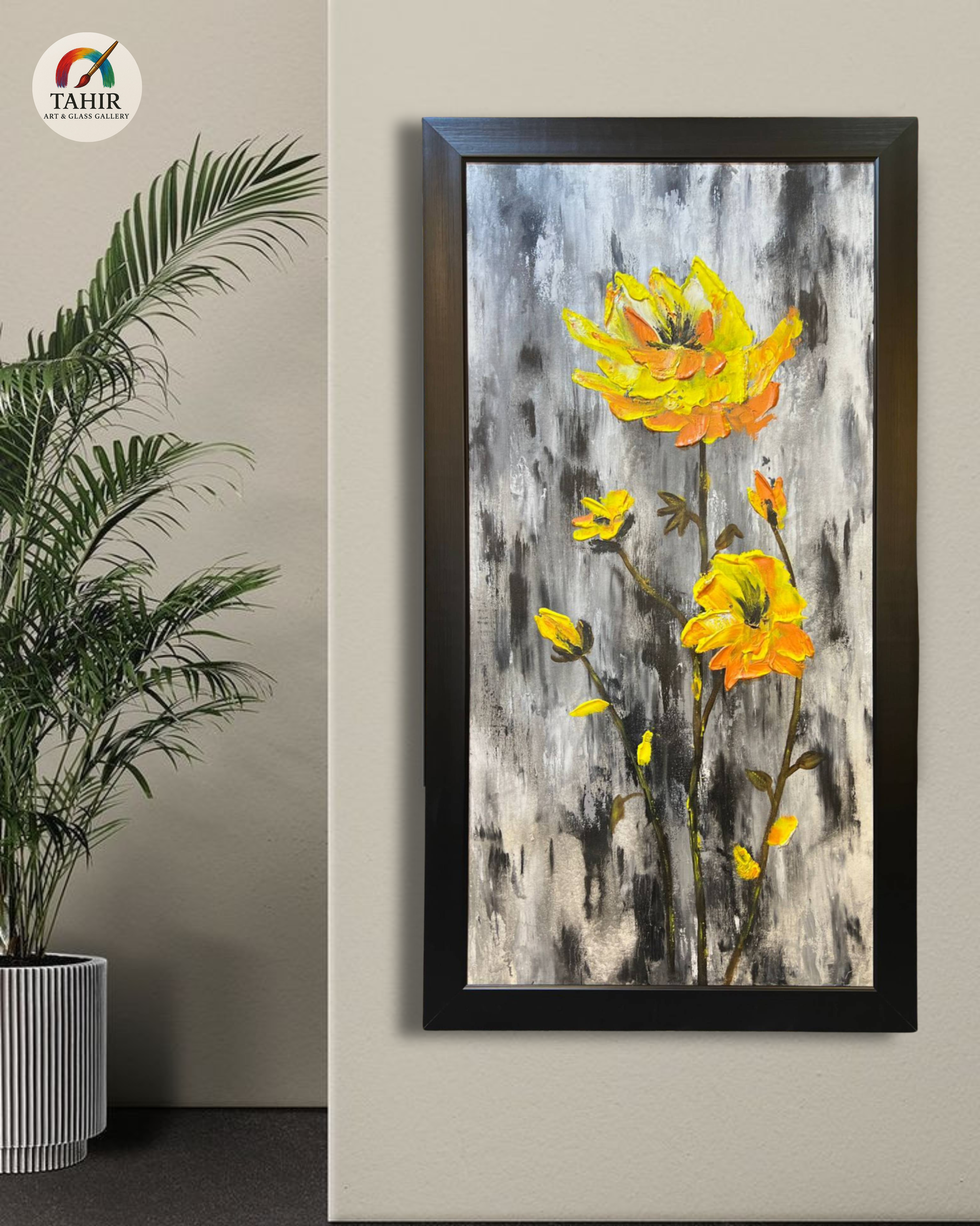 The bold yellow flowers stand out beautifully against the textured gray background, bringing warmth and elegance to any room.